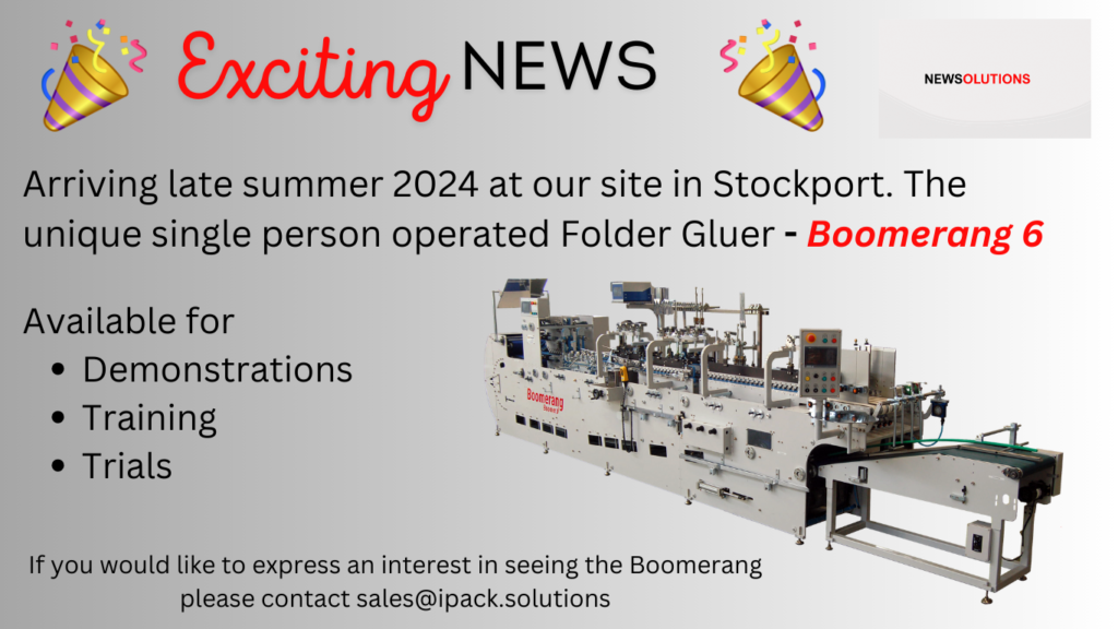 Arriving Summer 2024. The Boomerang 6 Folder Gluer at Ipack Solutions Posted on May 8, 2024January 27, 2025 by John