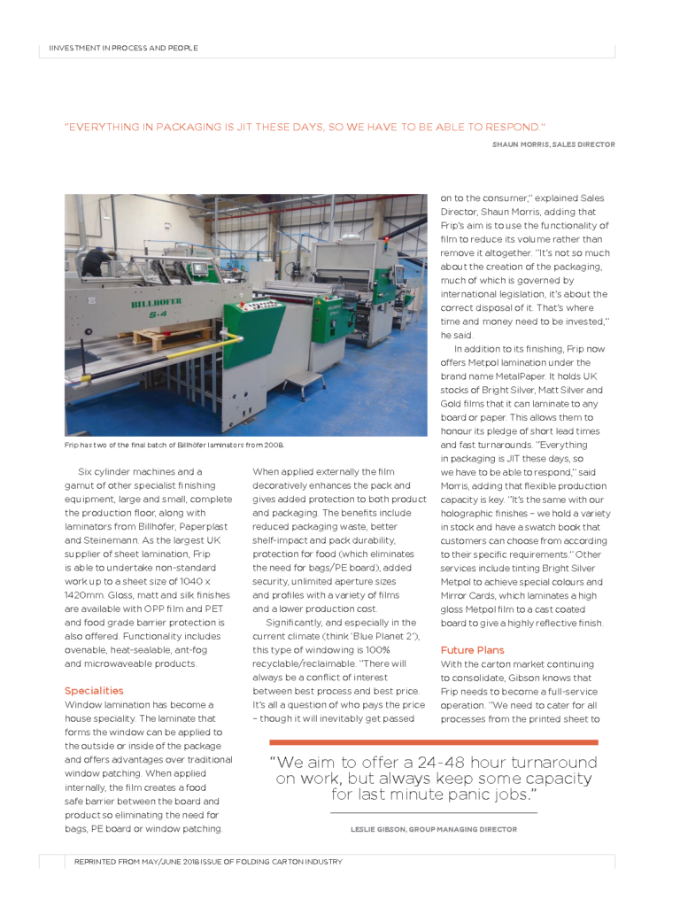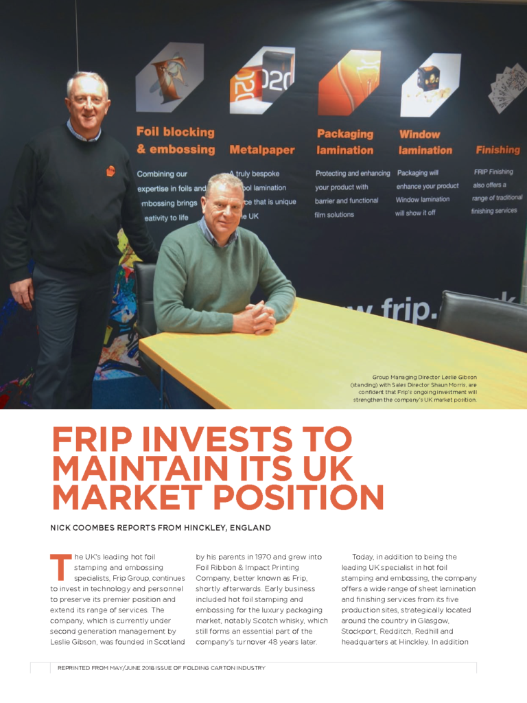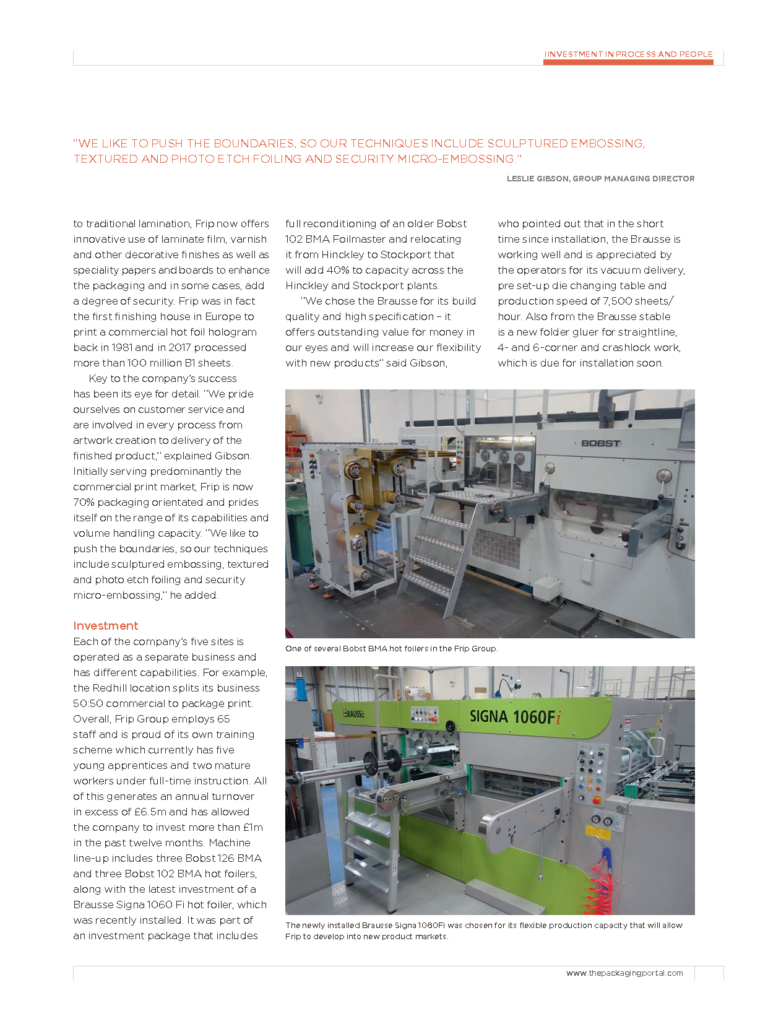 The UK’s leading hot foil stamping and embossing specialists, FRIP Group have invested in the all-new Brausse Signa 1060 Fi hot-foil stamping and embossing machine. The new machine was chosen for ‘its build quality and high specification and offers outstanding value for money, increasing our flexibility with new products’