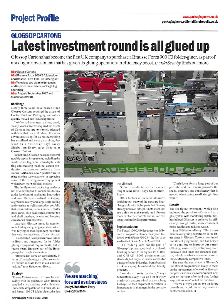 Article from the October ’18 edition of Packaging News of Glossop Cartons double Brausse folder-gluer investment, including the first all-new Forza 900 folder-gluer.